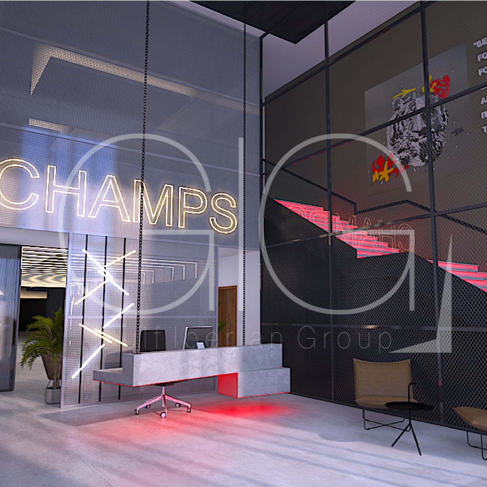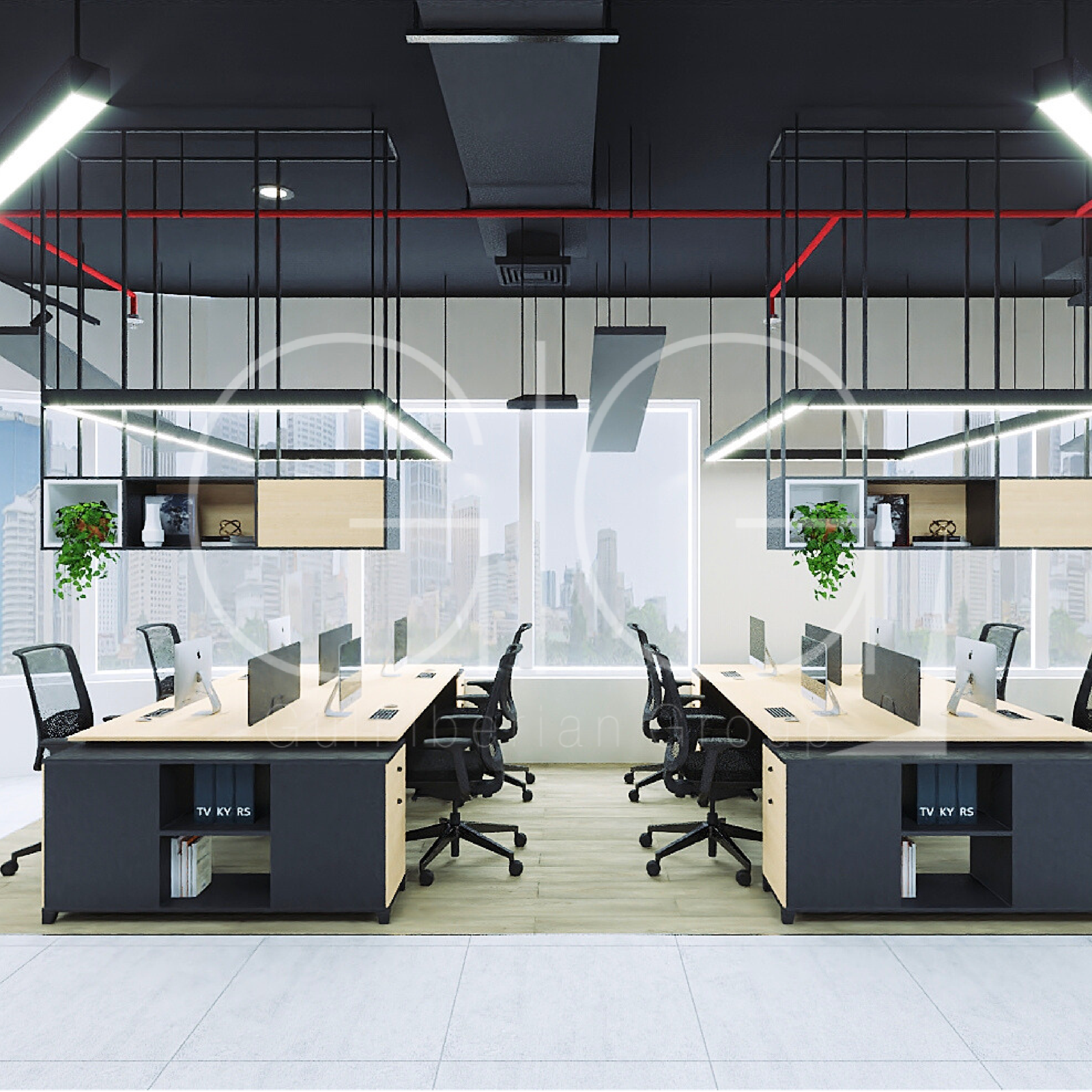 Una oficina tipo loft elegante que combina espacio abierto con sofisticación urbana.