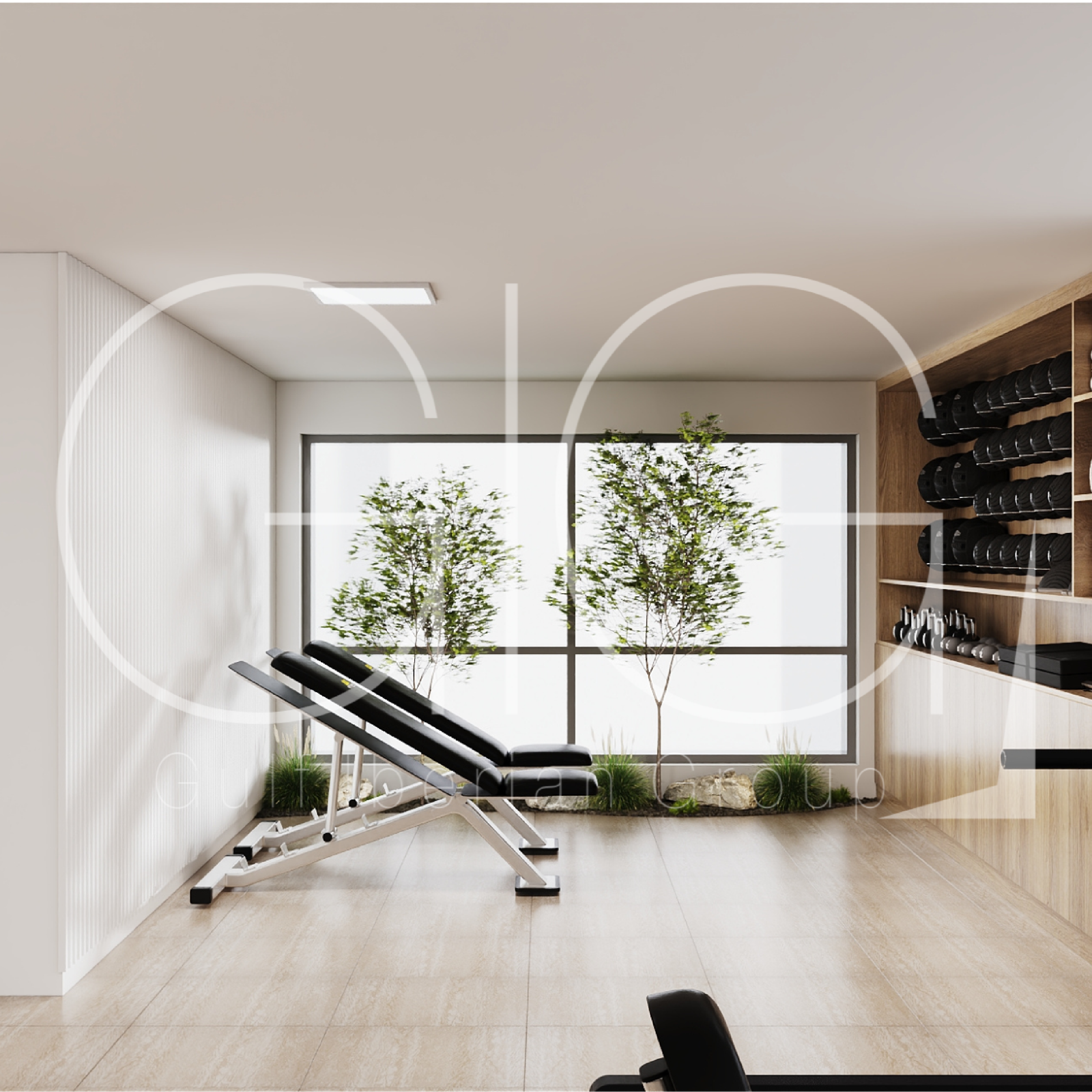 Espacio de entrenamiento moderno y luminoso, diseñado para ofrecer un ambiente relajado y funcional.